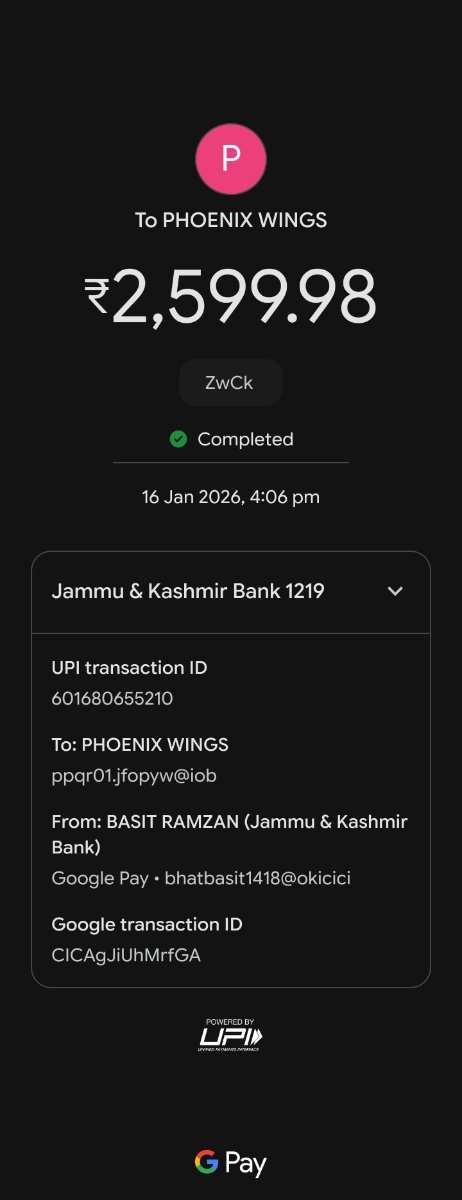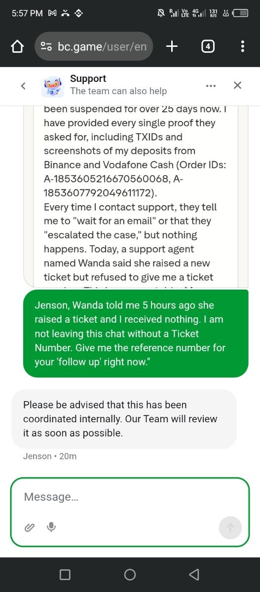 User ID: 18082229 Amount Paid: ₹2,599.98 (Google Pay) Amount Requested in App: ₹2,600.00 Date/Time: Jan 16, 2026 at 4:06 PM UPI Ref ID: 601680655210 Order ID: F-1854469339571698519 The Issue: When I scanned the QR code, the amount automatically adjusted to ₹2,599.98 on Google Pay. The payment was successful (see attached screenshot), but BC.Game marked it as "Failed." It has been 13 days and my support ticket (#9705839) was closed without a credit. Please manually credit the ₹2,599.98 to my account.