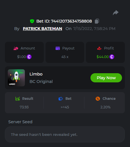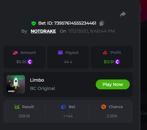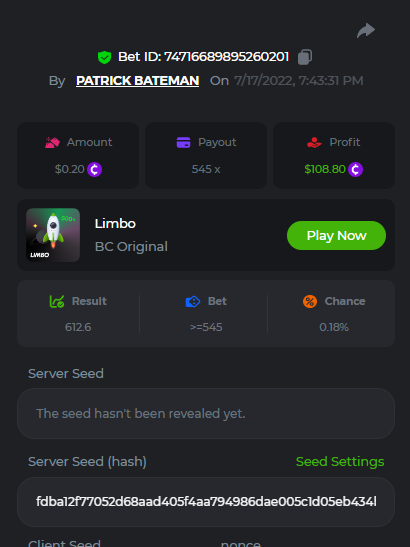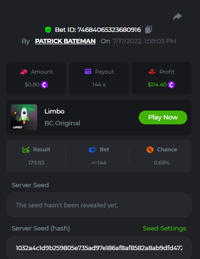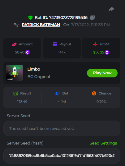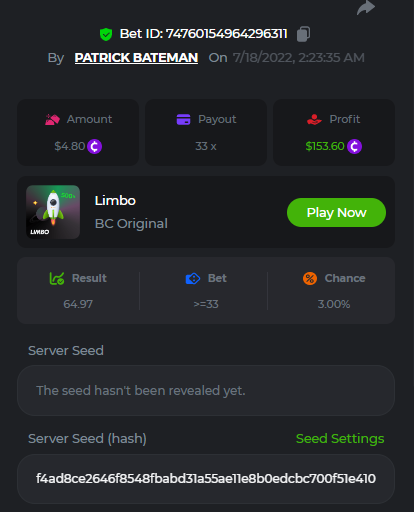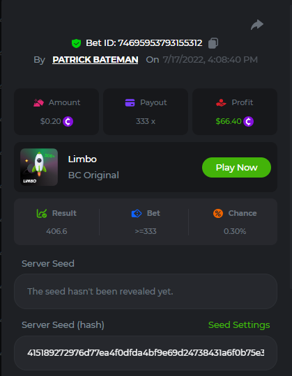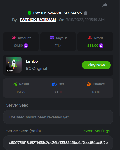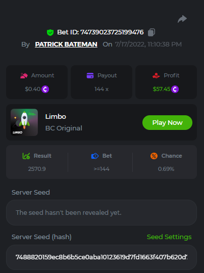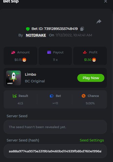 1. don't know how i can get the url for these bets but they are in my transaction history. https://hash.game/sd/?sd=10Q525VMSYVSWJ