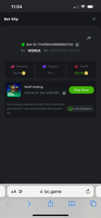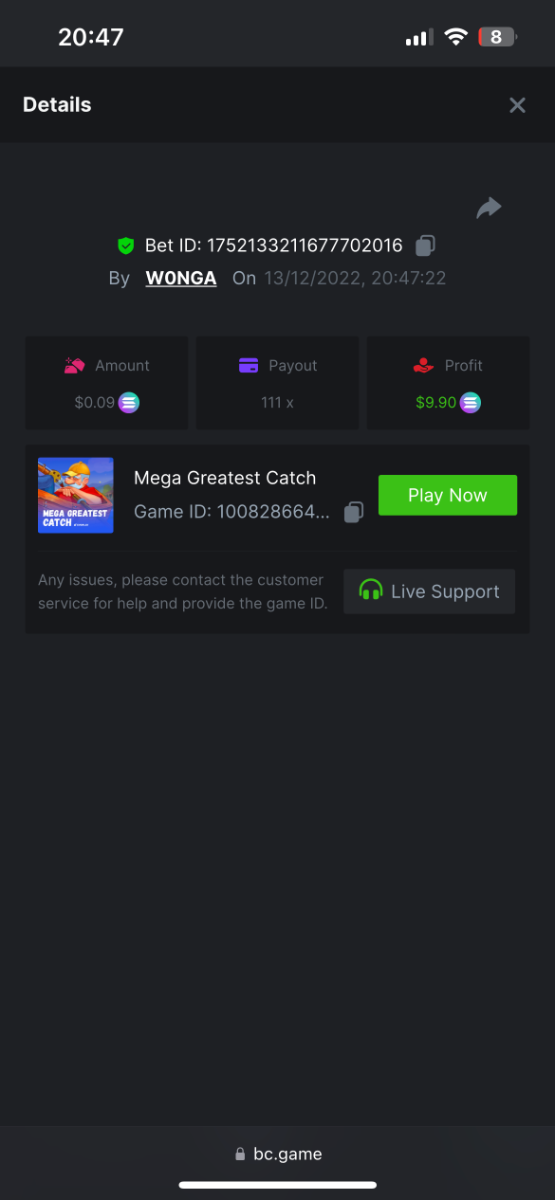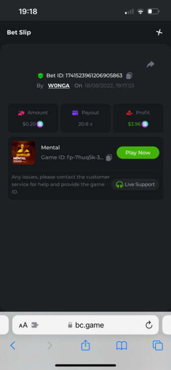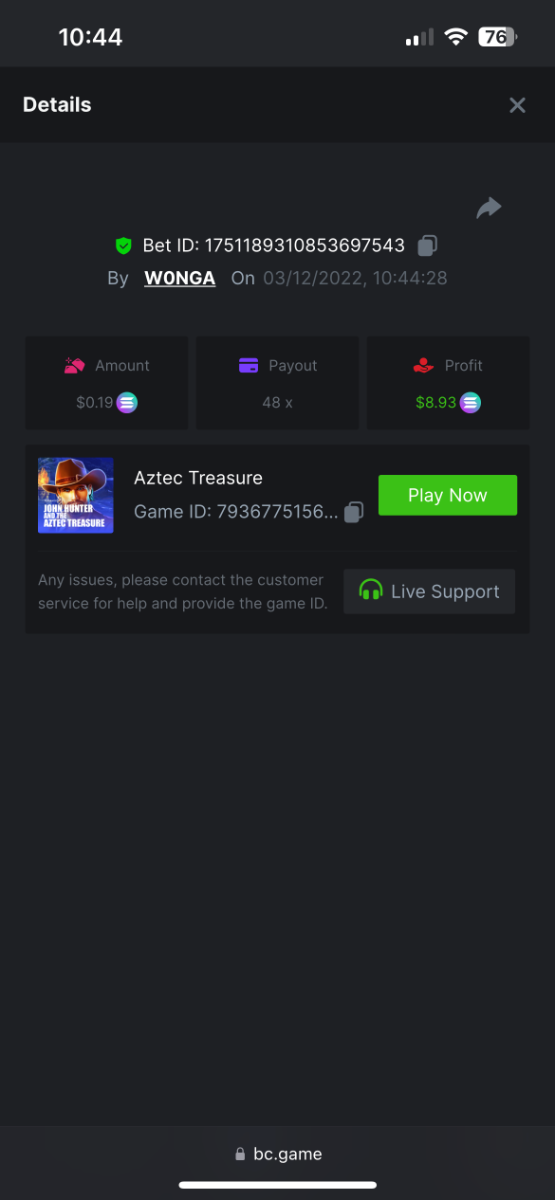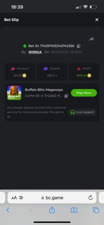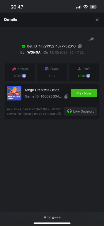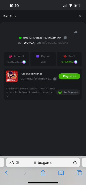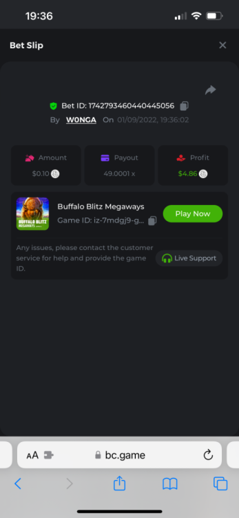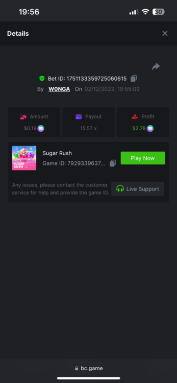 https://bc.game/#/sd/10YFF23M9VN76B This was a clean 50x win on $0.10! But the the dollar conversion says different. https://bcgame-dk2.pragmaticplay.net/gs2c/lastGameHistory.do?symbol=vs10bbbonanza&mgckey=AUTHTOKEN@11cc628b718a1c586678b11736e84ea3dfa730c7917478308de6e25bef028d13~stylename@bcgame_bcgame~SESSION@23942c19-4f81-4335-ac9a-6cefff7f9a75~SN@192ffaf4&tz=-00%3A00&mgckey=AUTHTOKEN@11cc628b718a1c586678b11736e84ea3dfa730c7917478308de6e25bef028d13~stylename@bcgame_bcgame~SESSION@23942c19-4f81-4335-ac9a-6cefff7f9a75~SN@192ffaf4 https://bc.game/#/sd/10YFG753VMQS5V https://bc.game/#/sd/10YFGJAIT2RMS3 https://bc.game/#/sd/10YFGXMC5YV8K3 https://bc.game/#/sd/10YGZ4VK6RWOIB -