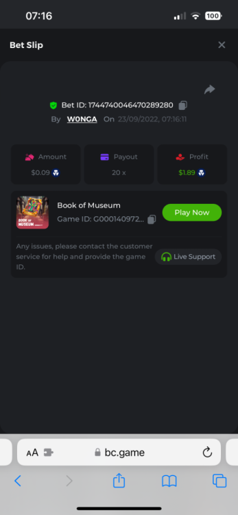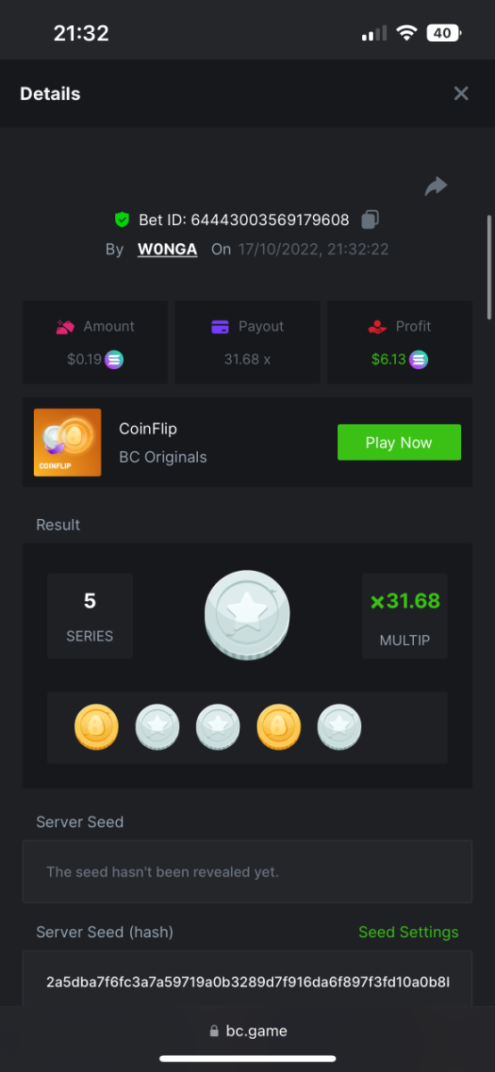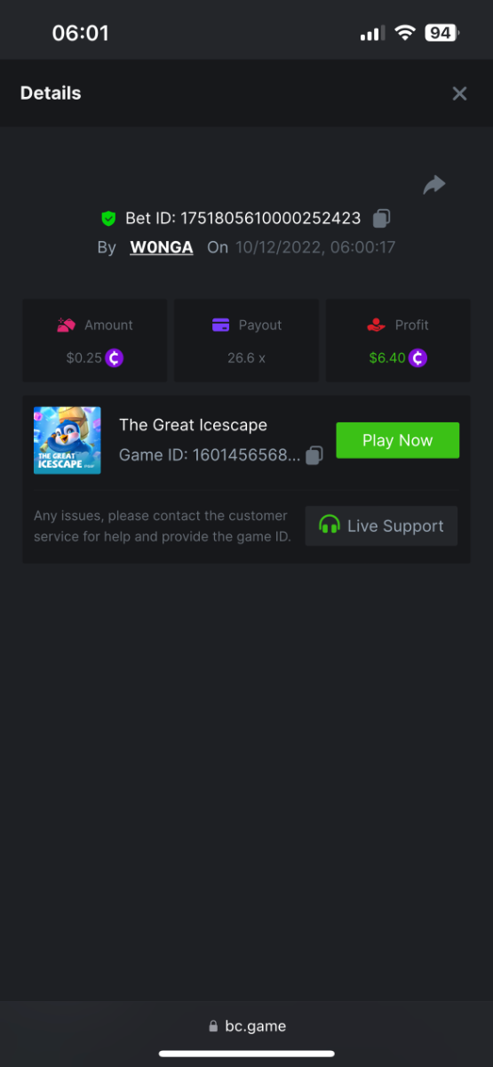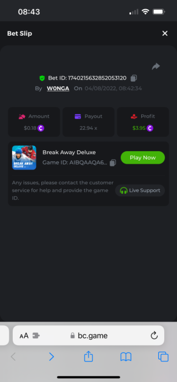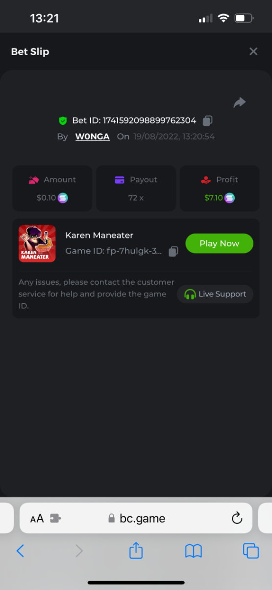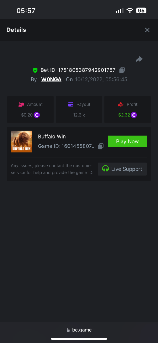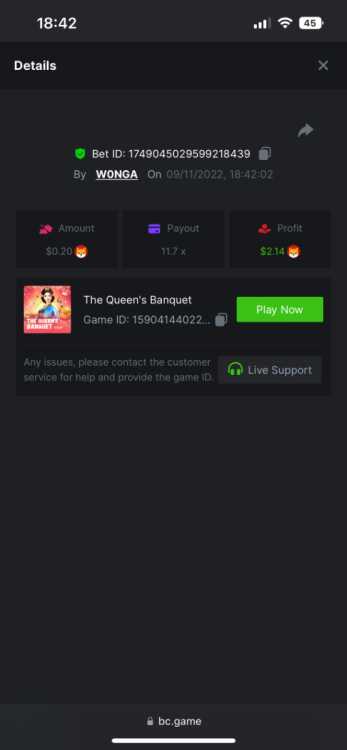 https://bc.game/#/sd/10YFF23M9VN76B This was a clean 50x win on $0.10! But the the dollar conversion says different. https://bcgame-dk2.pragmaticplay.net/gs2c/lastGameHistory.do?symbol=vs10bbbonanza&mgckey=AUTHTOKEN@11cc628b718a1c586678b11736e84ea3dfa730c7917478308de6e25bef028d13~stylename@bcgame_bcgame~SESSION@23942c19-4f81-4335-ac9a-6cefff7f9a75~SN@192ffaf4&tz=-00%3A00&mgckey=AUTHTOKEN@11cc628b718a1c586678b11736e84ea3dfa730c7917478308de6e25bef028d13~stylename@bcgame_bcgame~SESSION@23942c19-4f81-4335-ac9a-6cefff7f9a75~SN@192ffaf4 https://bc.game/#/sd/10YFG753VMQS5V https://bc.game/#/sd/10YFGJAIT2RMS3 https://bc.game/#/sd/10YFGXMC5YV8K3 https://bc.game/#/sd/10YGZ4VK6RWOIB -