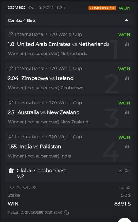 16. Hey @BCGame_Ninja, having read this I was wondering if we are allowed to make parlay bets other than just "Winner (Incl. super over)" markets for each game. I understand that we can't bet on 2 markets of the same game, but can we bet on "overs 0 to 10" on one game and "total run outs" of another game for example? Orrr did you mean you can't have multiple parlay bet wins that have the same game in either one of the parlay bets - that case only one parlay bet will be counted?