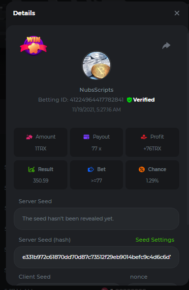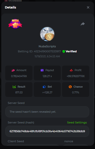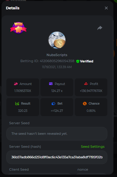 Yes this thread is a little old but hopefully you all are still around. I'm going to post a script from 3 years ago. I'm pretty sure the responses from server have changed so it won't run. However, this script will change the payout based upon the board. At one point it ran on ng for almost 30 days straight without interruption. Documented and posted screenshots along the way. Started with free 0.005 Eth from spider back then and got it up to 0.89 Eth and then I got scared and shut it down. //******************* Nubs27's Smart Script for Crash ******************* // // // // If you find this script helpful please consider donating to Nubs27 or tipping on NanoGames.io: // Referral Link: https://n-luzqe.nanogames.io/ // // Donations accepted in many coin/token types. List & Addresses: // https://sites.google.com/view/nanogamescrashscripts/home/donation-addresses // // // var config = { mainTitle: { label: '*** Nubs27\'s Smart Script for Crash ***', type: 'title' }, auto: { label: '', value: 'Script', type: 'radio', options: [ { value: 'Script', label: 'Script chooses Base Bet'}, { value: 'Player', label: 'Player chooses Base Bet'} ]}, bet: { label: 'Base Bet', value: currency.minAmount, type: 'number' }, lossTitle: { label: 'Stop When ', type: 'title' }, stop: { label: 'Coins Lost >', value: 1, type: 'number' }, end: { label: 'Minutes >', value: 250, type: 'number' }, profit: { label: 'Profit >', value: 100, type: 'number' }, }; function main () { //PayOuts checked in the Stats Update const MultiplierArray = [2.5, 3.00, 5.00, 6.00, 7.00]; const LMultiplierArray = [10.00, 20.00, 50.00, 100.00]; var version = "v2.3"; var PayOutPercents = []; var PayOutConfidence = []; var Array2Filter = []; var FilteredArray = []; var ScriptHistory = []; var Trains = []; // Red Train IDs - finding gaps between & correlation between gap & duration var History = []; var RoundsPlayed = 0; var RoundsViewed = 0; var LastGameID = 1; var CurrentGameID = LastGameID + 1; var MinimumBet = currency.minAmount; var MaxBet = (currency.amount / 10); var TotalBets = 0; var CurrentMultiplier = MultiplierArray[1]; var LastMultiplier = MultiplierArray[1]; var MaxLossesEncountered = 3; var MostLost = 0; var LargestMulitplier = 2; var BaseBet = config.bet.value; var CurrentBet = BaseBet; var LastBet = BaseBet; var LastShrek = CurrentGameID; var LastTrain = 0; var Gap = 0; var AverageGap = 0; var LargestBet = [0,0]; var Enable100ID = 1000000; var LastResult = "Won"; var CoinLost = 0; var StopLossCoin = config.stop.value; var Losses = 0; var Wins = 0; var Red = 0; var Green = 0; var StartTime = new Date(); var EndTime = new Date(); var TimeDiff = (EndTime - StartTime); var StartBalance = currency.amount; var EndBalance = 0; var Profit = 0; var ATHProfit = 0; var ProfPerMin = 0; var NetProfit = 0; var DisplayGreeting = "False"; var GotHistory = "False"; var BetYet = "False"; var LoggedBetData = "False"; var GameInfoLogged = "False"; var StrategyFound = "False"; var IsPlaying = "False"; var UpdateBets = "False"; var Enable100 = "False"; var LastCrash = 0; var PrevCashOut = 0; var WonAmount = 0; var FindThisMultiplier = 1; var FindShouldHave = 2; var ThisAverage = 1; var HistorySlice = 50; var Paused = "True"; var IndexMax = PayOutConfidence[0]; var MaxIndex = 0; var GetNumber = 0; // Welcome the Player to the Script console.clear(); engine.on('GAME_STARTING', function () { if (DisplayGreeting == "False") { log.info(' Nubs27s Smart Script for Crash'); log.info(" ****************"); log.info("See Web Console for more Information (Press F12)"); console.log('%c~~~~~~~~~~~~~~~~~ Nubs27\'s Smart Script for Crash ~~~~~~~~~~~~~~~~~','color:Purple; font-weight:bold'); console.log('%cScript Start Time: ' + StartTime,'color:Purple; font-weight:200'); console.log(' %cWelcome ' , 'color:Purple; font-weight:bold'); console.log(' %cYour Starting Balance is: ' + StartBalance + ' ' + currency.currencyName, 'color:Purple; font-weight:bold'); if (config.auto.value == 'Player') { if (config.stop.value > currency.amount) { MaxBet = (currency.amount / 10); config.stop.value = currency.amount * 0.98; console.log('%c[WARNING]: Stop Loss is above your Bankroll','color:Orange; font-weight:bold'); console.log('%c[WARNING]: Stop Loss Updated to ' + config.stop.value, 'color:Orange; font-weight:bold'); } if (config.bet.value > (config.stop.value / 15000)) { log.info('[WARNING]: Script Recommends a bankroll of at least ' + (BaseBet * 15000) + '' + currency.currencyName + ' for the Base Bet you provided'); log.info('[WARNING]: Script Recommends a bankroll of at least ' + (BaseBet * 20000) + '' + currency.currencyName + ' for the Base Bet you provided'); log.info('[WARNING]: Script Recommends a bankroll of at least ' + (BaseBet * 25000) + '' + currency.currencyName + ' for the Base Bet you provided'); } console.log(' %cYou Input: ' + BaseBet + ' ' + currency.currencyName + ' as the Base Bet', 'color:Purple; font-weight:bold'); }else{ betupdate(); console.log(' %cYour Starting Base Bet is: ' + BaseBet + ' ' + currency.currencyName, 'color:Purple; font-weight:bold'); } console.log(' %cYour Stoppers are: Coin Lost > ' + config.stop.value + '; Minutes > ' + config.end.value + '; Profit > ' + config.profit.value, 'color:Purple; font-weight:bold'); console.log('%c~~~~~~~~~~~~~~~~~~~~~~~~~~~~~~~~~~~~~~~~~~~~~~~~~~~~~~~~~~~~~~~~~~','color:Purple; font-weight:bold'); if (config.stop.value > currency.amount) { MaxBet = (currency.amount / 10); config.stop.value = currency.amount * 0.95; console.log('%c[WARNING]: Stop Loss Updated to ' + config.stop.value, 'color:Orange; font-weight:bold'); } } DisplayGreeting = "True"; if (GotHistory == "False") { getnanohistory(); GotHistory = "True"; console.log(ScriptHistory); LastShrek = []; LastTrain = []; } // // // //Everything above here only runs 1 time console.log(' ----------------------------'); CurrentGameID = (LastGameID + 1); console.log('[Round ID]: ' + CurrentGameID); if (StrategyFound == "False") { strategy(); } //Checks Us