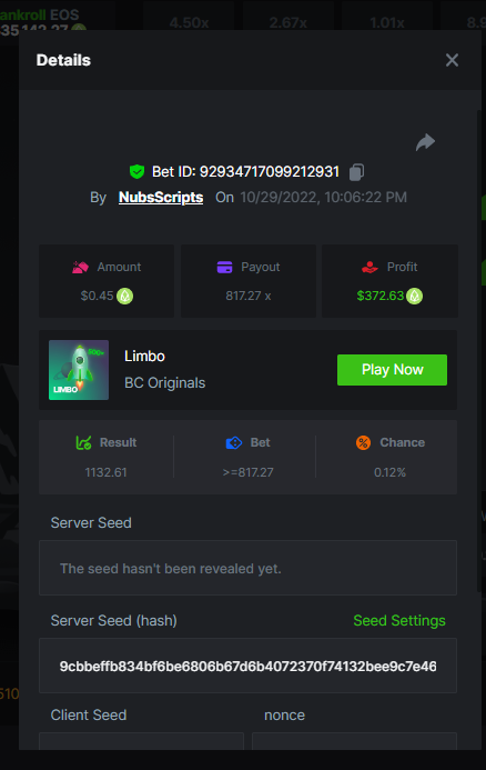 Thanks Skele, Yes, Cryptorichi that was the last version of the script I did. I now play manually with Hash Dice or Limbo. That script is based upon the losses you have incurred so far. It doesn't anticipate anything. Therefore, there will come a time when the gap between wins will be too great to overcome. By grabbing the last 2k rounds, I should be able to incorporate the Deep Learning api into it. Although it wouldn't be perfect it would return better results than the v2.3. We used to do it with Hash Dice until the game engine changed. Crash is really slow, I used to only play Crash, but now I rarely do. 14k rounds in a day for Crash compared to 100k rolls for Limbo/Hash Dice.