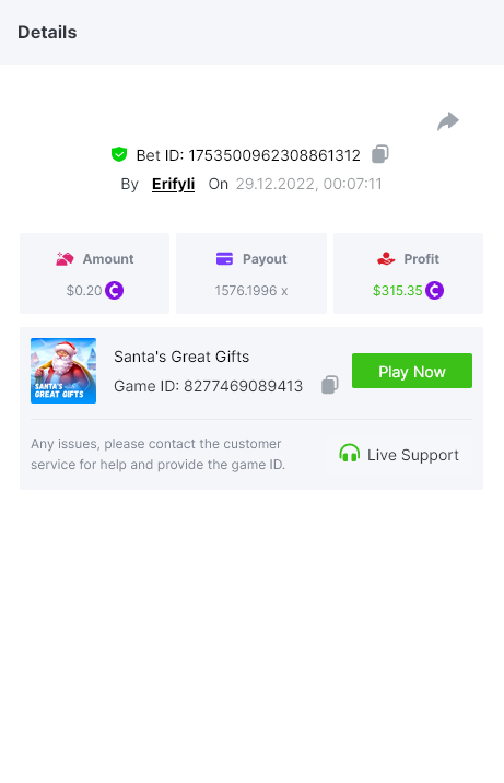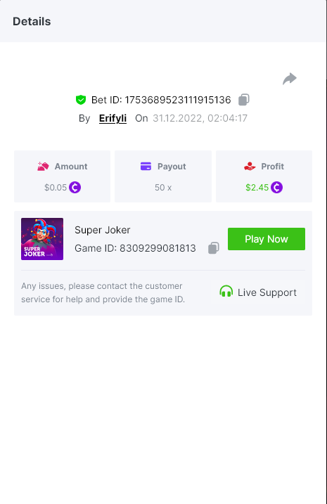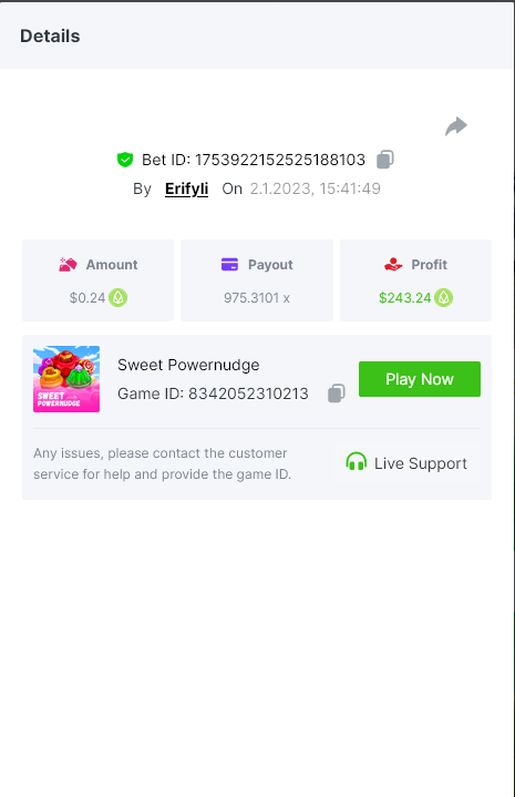 6. Bounty ? https://bc.game/#/sd/1123A7FXI98S9F The exact amount paid in the game was 50x but the multi shown is 0.05 higher than in reality. Not sure if this counts as bounty. https://bc.game/#/sd/1123L1X3SF7YTV https://bc.game/#/sd/111XF58ISYZR4J https://bc.game/#/sd/111X8MPZ776SYB https://bc.game/#/sd/111XAGX5V8YMMR https://bc.game/#/sd/1121WOEHI0AT5F https://bc.game/#/sd/111XKLL6U67THV