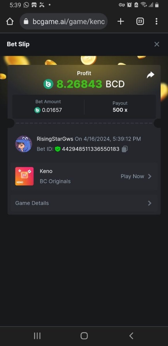 Moderator Giandreas Posted April 16, 2024 Moderator Share Posted April 16, 2024 Read Carefully Before Start To Hunt Forum Daily Challenges #572Hunt : Keno Win the highest pay out Min Payout : 90 Min Level 10️Duration Starting : Now End time : 23.59 UTC Time How to Join? Make screenshot + paste your bet link + UID or Profile link Any coin, with min bet 0.01 USD is allowed (jb/bb/bcl not allowed)Reward Prizes 1st Place.....$7 BCD 2nd Place.....$5 BCD 3rd Place.....$4 BCD 4th Place.....$3 BCD 5th Place.....$2 BCD 🏵 Winners will be announcing next day after Roll Point! 1 Link to comment Share on other sites More sharing options...
