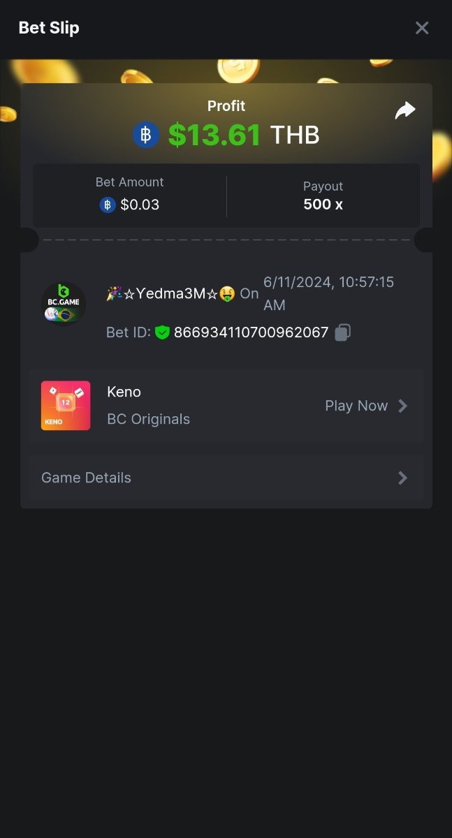 Moderator Giandreas Posted June 11, 2024 Moderator Share Posted June 11, 2024 Read Carefully Before Start To Hunt Forum Daily Challenges #628Hunt : Keno Win the highest pay out Min Payout : 90x Min Level 10️Duration Starting : Now End time : 23.59 UTC Time How to Join? Make screenshot + paste your bet link + UID or Profile link Any coin, with min bet 0.01 USD is allowed (jb/bb/bcl not allowed)Reward Prizes 1st Place.....$7 BCD 2nd Place.....$5 BCD 3rd Place.....$4 BCD 4th Place.....$3 BCD 5th Place.....$2 BCD 🏵 Winners will be announcing next day after Roll Point! 1 Link to comment Share on other sites More sharing options...